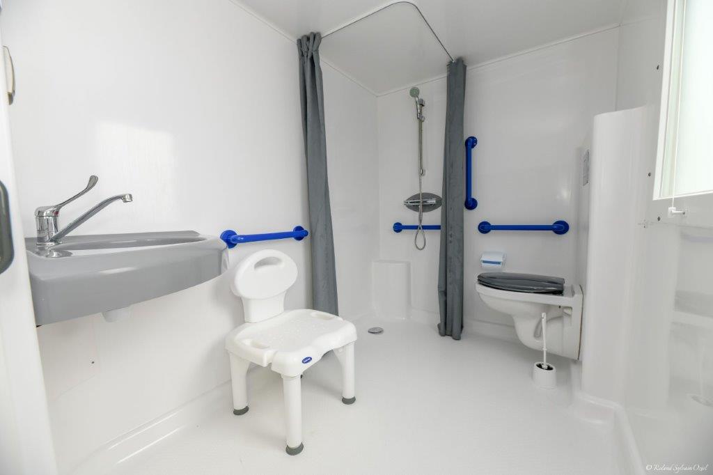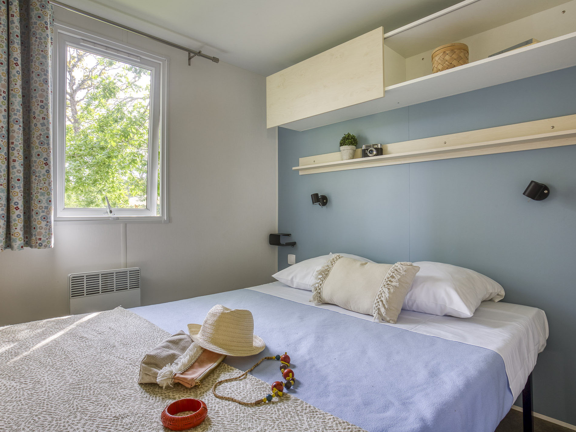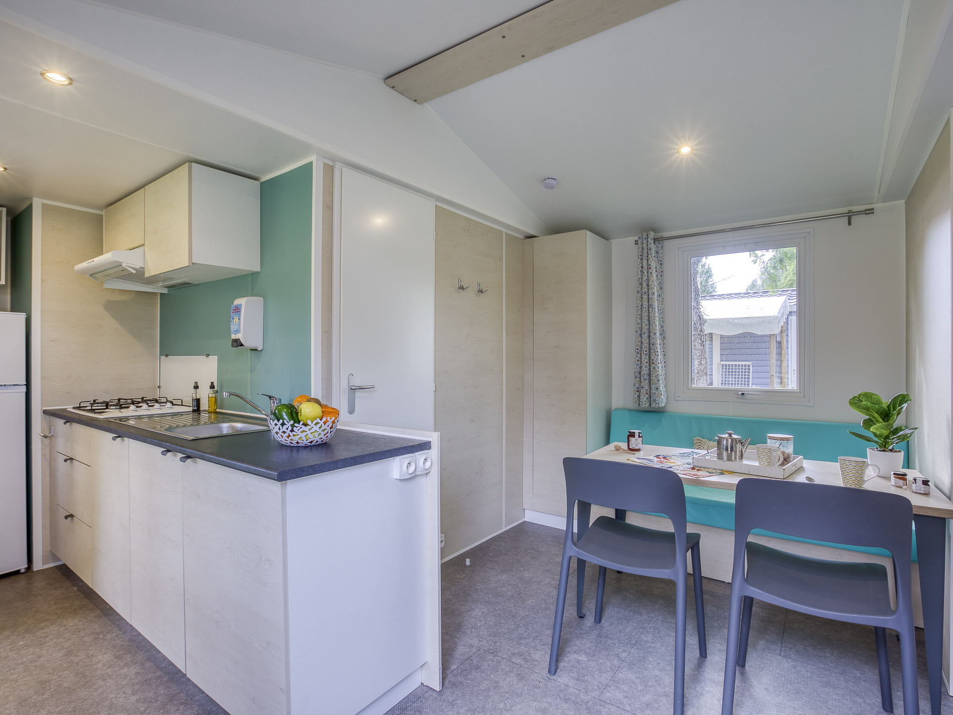 Mobil-home avec terrasse, équipement standard, idéal pour passer un agréable séjour, adapté aux personnes à mobilité réduite.